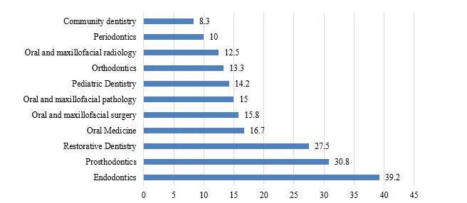 According to dental students’ opinions, the dental subspecialties most negatively affected by quarantine are shown in Figure 1. Endodontic (39.2%) followed by prosthodontics (30.8%) were the two most negatively affected subspecialties while community dentistry (8.3%) and periodontics (10%) were the two least negatively affected subspecialties.