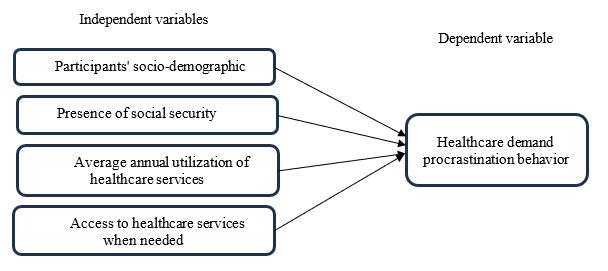The study dependent variable was healthcare demand procrastination behavior. The independent variables included participants' socio-demographic characteristics, presence of social security, average annual utilization of healthcare services, and access to healthcare services when needed