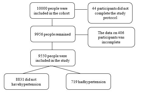 A total number of 9,550 participants who had enrolled in the baseline phase of the Shahedieh Cohort study in Yazd, Iran, were included in the present study. Their mean age (± SD) was 49.68 (± 9.54) while 4,777 (%50.02) of them were males and 4,773 (%49.98) were females.